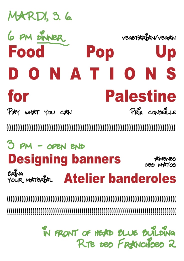 Next Tuesday (June 3rd) in the late afternoon, a pop-up meal will be held in the courtyard of Building A (blue), organized by Visual Arts students. The meal will be open pricing, and the money raised will be donated to organizations like Rebuild Gaza, as well as to campaigns for Palestinian families in urgent need of all kinds of financial assistance.